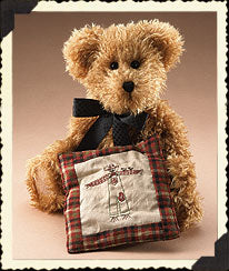 Abner warm up after the harvest with a plaid-trimmed quilt with scarecrow embroidery. His soft and cuddly rust chenille fur helps out a lil' bit, too! Abner is jointed with bean and poly filling.